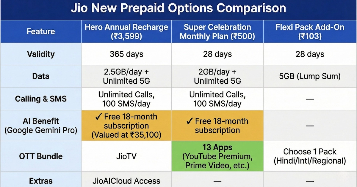 Jio has introduced three new prepaid options, each targeting different user segments. Let me break down what you actually get: