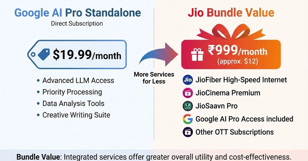For Jio, AI becomes a retention lever — the same playbook they used with OTT bundles during the streaming wars. Why switch to Airtel when your Jio plan includes premium AI access?