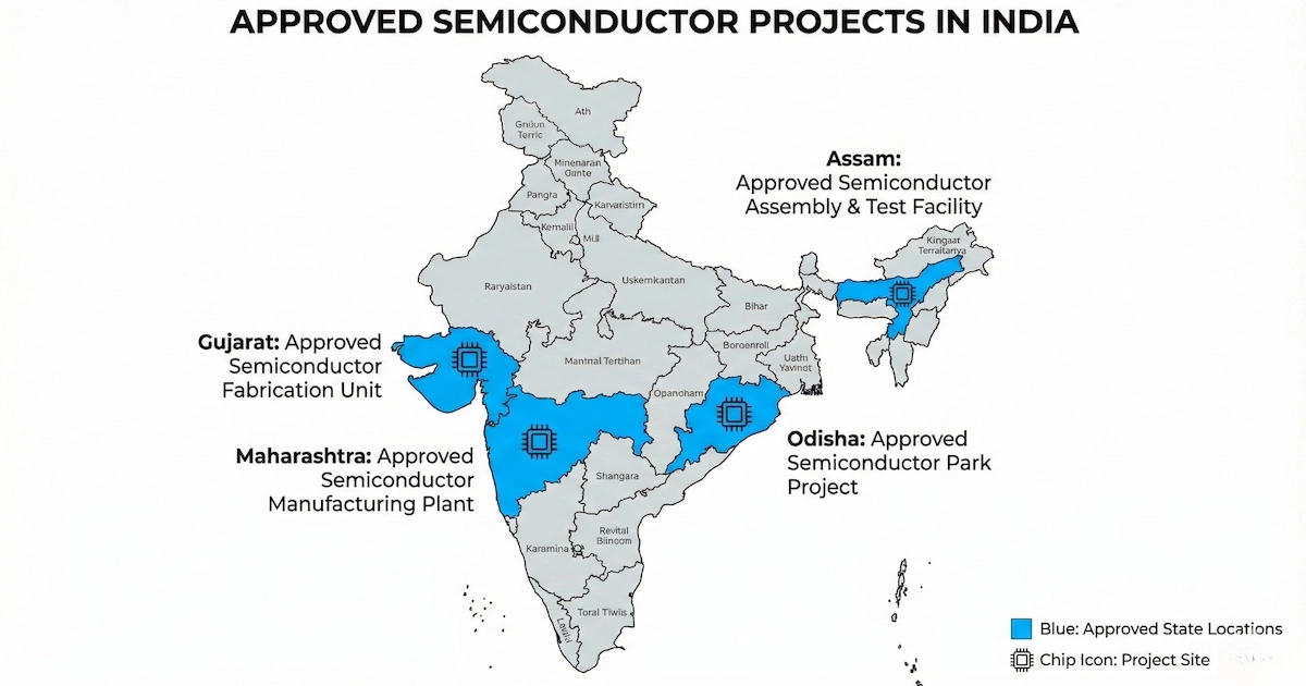 The India Semiconductor Mission has approved 10 projects worth over $18 billion across six states. Tata Electronics is building a ₹91,000 crore fab in Dholera, Gujarat, in partnership with Taiwan's PSMC. Micron's ₹22,516 crore ATMP facility in Sanand is already producing test chips. Prime Minister Modi announced at SEMICON India 2025 that Made-in-India commercial chips will hit the market by end of 2025.