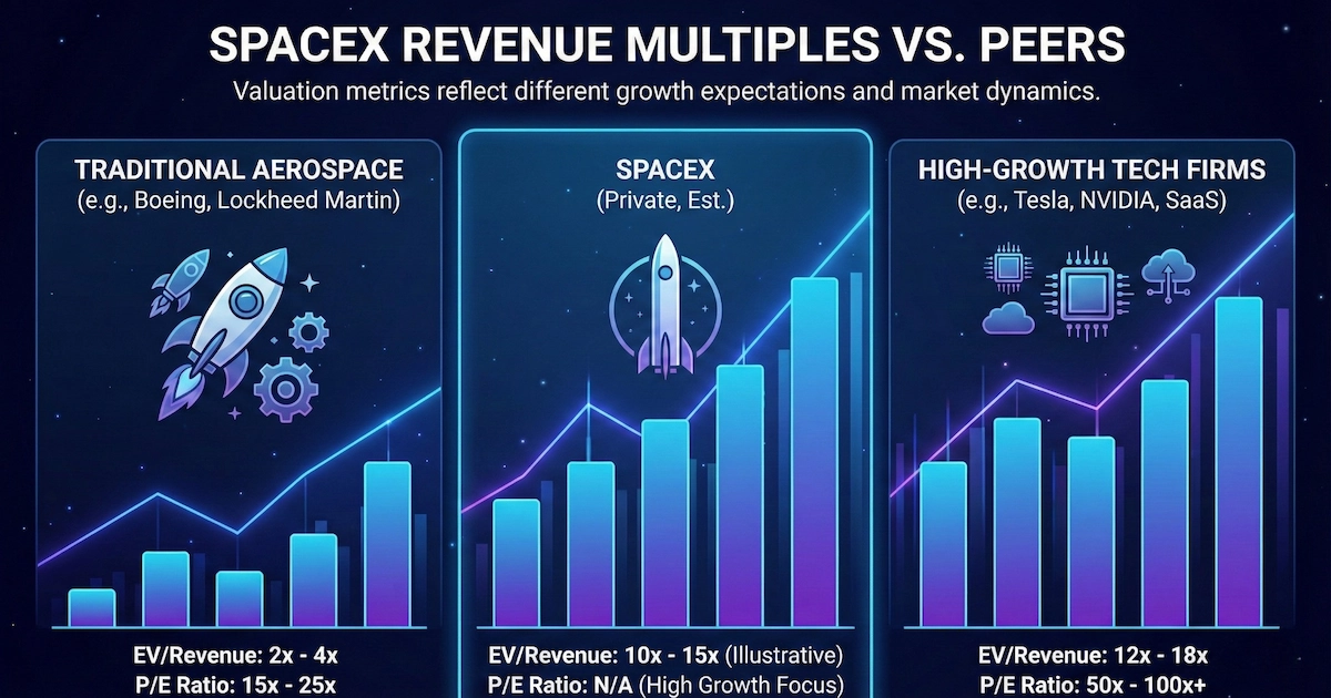 For context: Palantir Technologies, one of the market's most aggressively valued tech companies, trades at about 70x sales. Mature aerospace primes like Boeing, Lockheed Martin, and Airbus trade in single-digit EV/EBITDA multiples. SpaceX isn't being valued like a defense contractor—it's being priced like a high-growth tech platform with monopolistic characteristics.